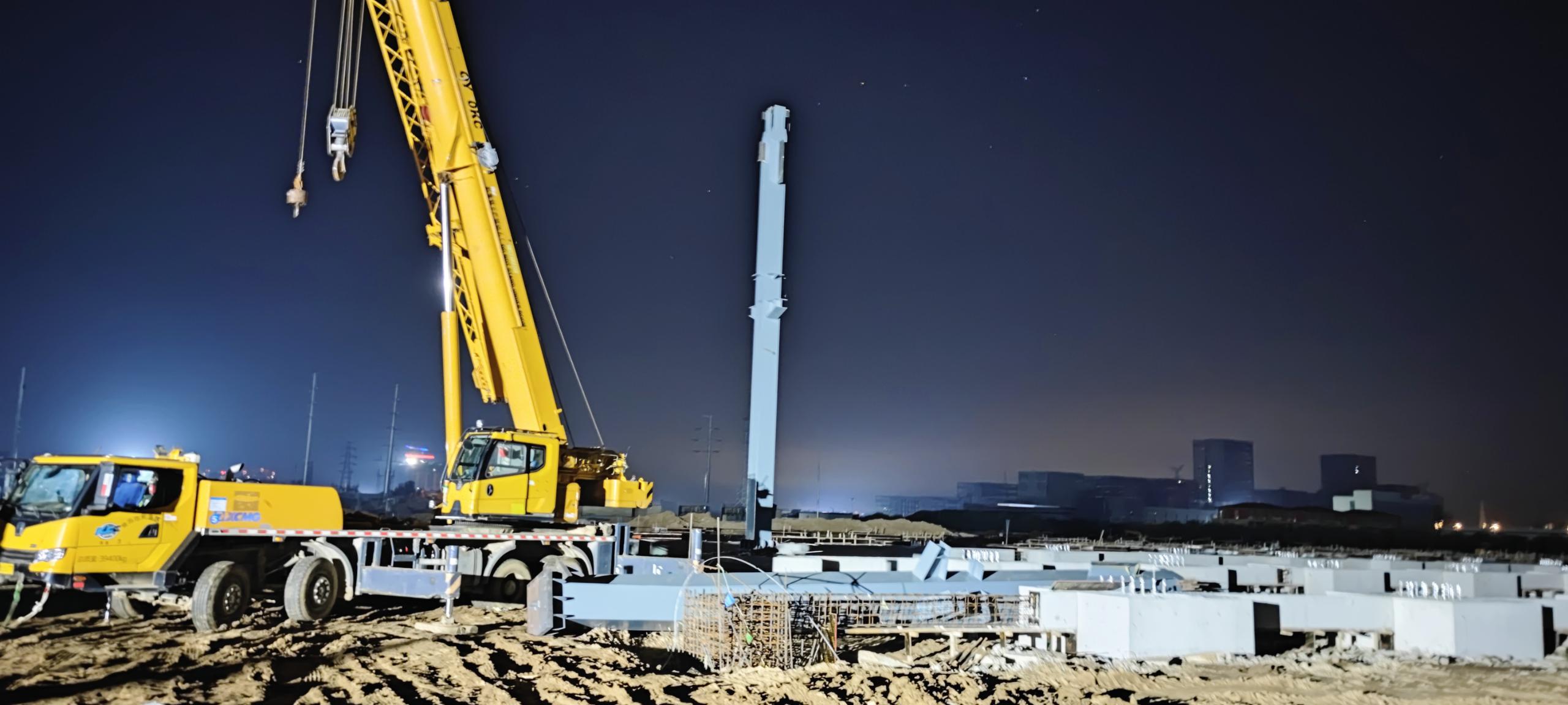 ▲項目首根型鋼柱安裝施工現場